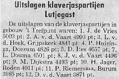 uitslagen klaverjaspartijen; J. de Vries, A. v/d Vaart, L. v/d Hoek P. Huizinga, D. Ites, L. Douma, J. v/d Vaart, M. Dijkstra, H. Jager, P. Riemersma