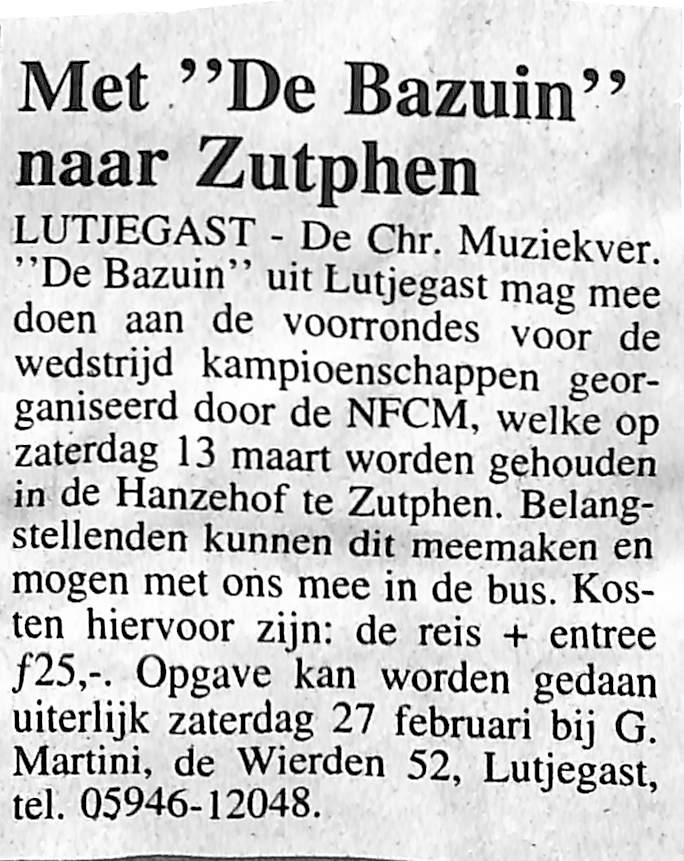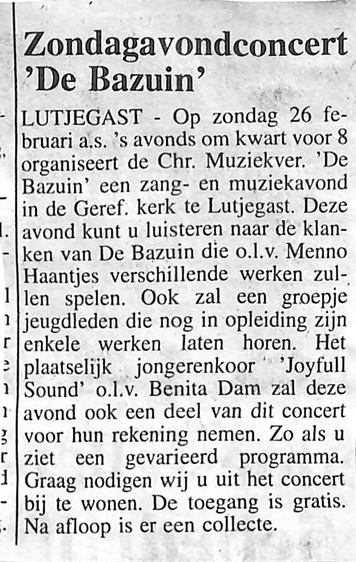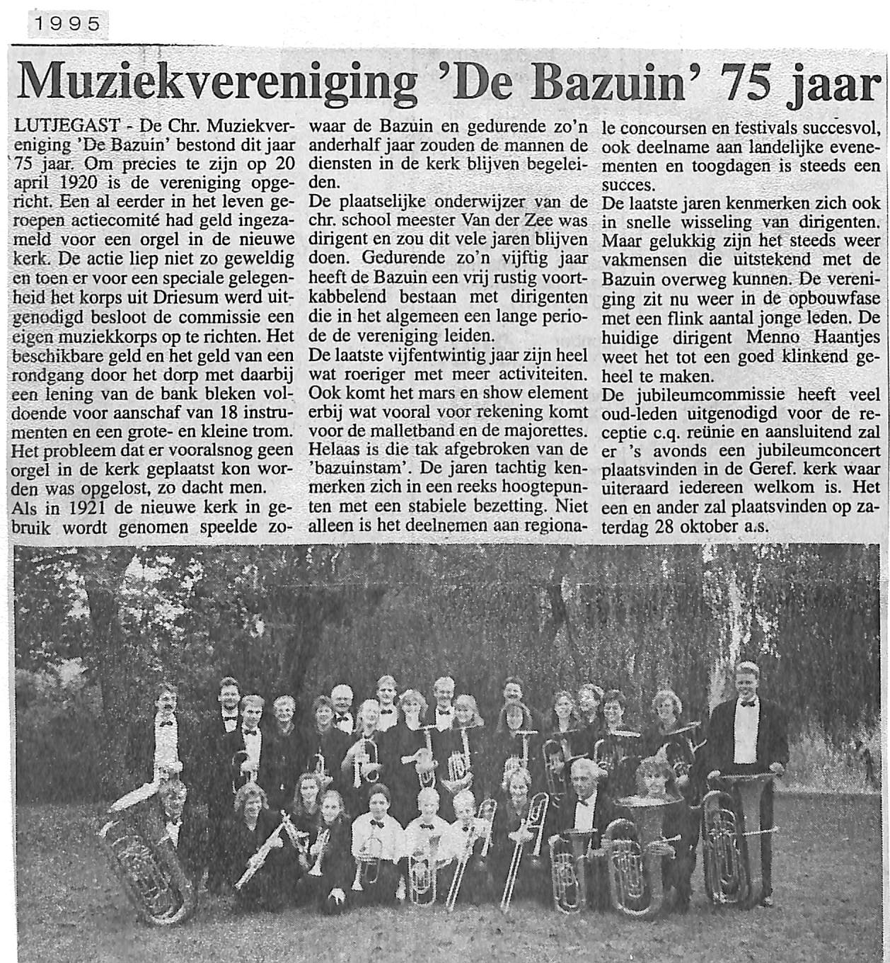 ter gelegenheid van het 70-jarig bestaan van de Muziekvereniging De Bazuin werd er een concert gegeven; H v/d velde, T. Fabriek, Anne Oost, Jochum de Vries, Bert Vink, Bert v/d Velde, D. Dijkstra, Rieks v/d Velde, Benita Dam, Auke de Haan,