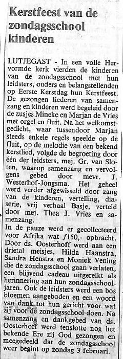 Kinderzang werd begeleid door Mineke en Marjan de Vries, een gebed door mevr. J. Westerhof - Jongsma, verhaal door Thea J. Vries en samenzang. Collecte Afrika...en drie meisjes Hilda Haanstra, Sandra Henstra en Moniek Vening verlaten de zondagsschool. Ze krijgen een cadeau van d.s. Oosterhoff.