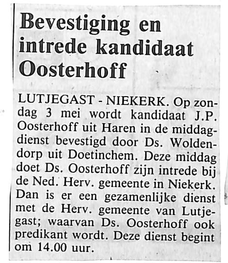 Ds. J. P. Oosterthoff uit Haren doet zijn intrede in Ned. Herv kerk in Niekerk / Lutjegast