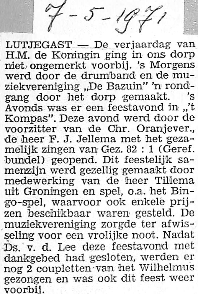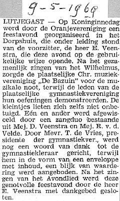 Chr. Nat. Oranjevereniging viert Koninginnedag. De Bazuin gaat rond door het dorp en speelt op plein voor Geref. Kerk. Toneelavond. Chr. Toneelver. "Unitas" uit Hoogkerk speelt blijspel in 4 bedrijven genaamd "De onbekende wereld", afgewisseld door orgelspel