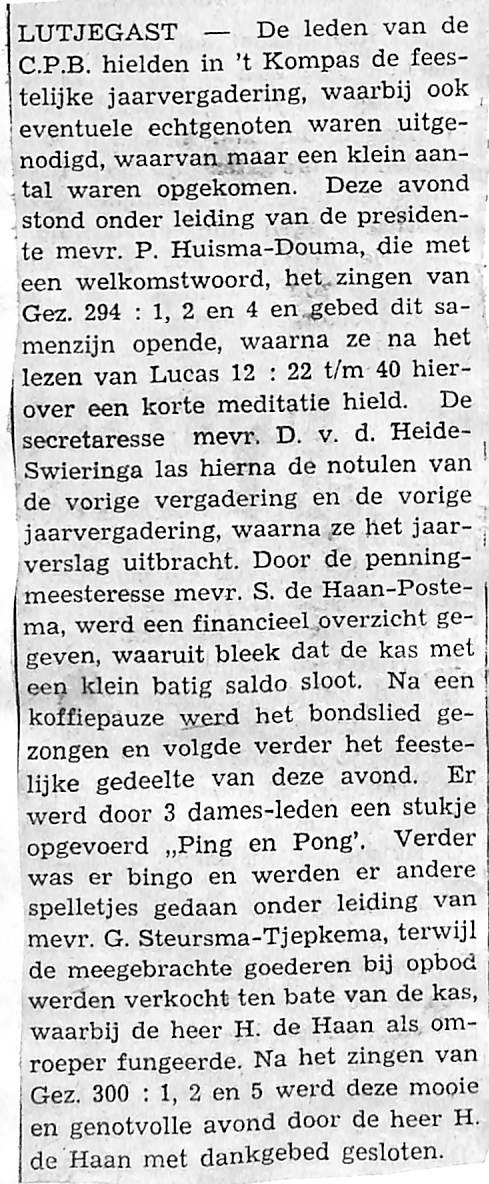 de leden van de C.P.B hielden een Feestelijke vergadering; P. Huisma-Douma, D v/d Heide-Swieringa, S. de Haan-Postema, G. Steursma-Tjepkema, H. de Haan
